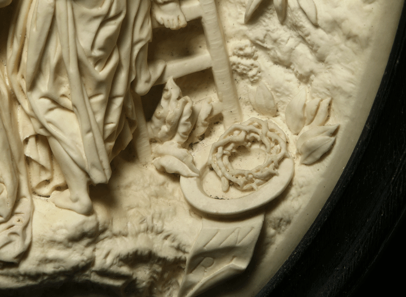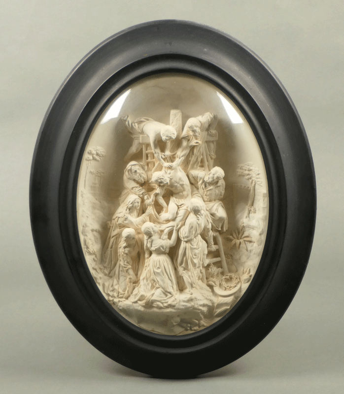 石膏あるいは漆喰を用いた19世紀フランスのキリスト教彫刻には、民衆芸術の域を全く出ない作例も多いですが、本品は本格的芸術の領域に大きく踏み込んだ秀作です。