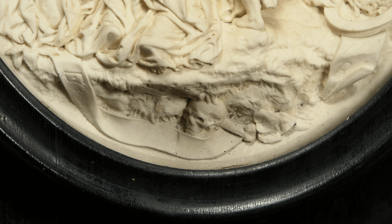この浮き彫り彫刻では、群像の足下に、地中に埋められた人祖アダムの骨が彫られています。