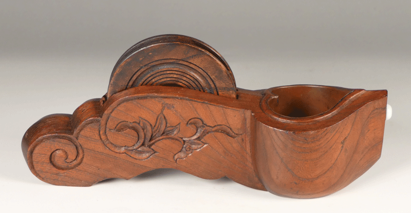 木目の美しい欅(けやき)製の墨壺は古式の意匠で造られており、両側面に若葉文様が彫り込まれています。