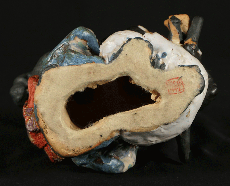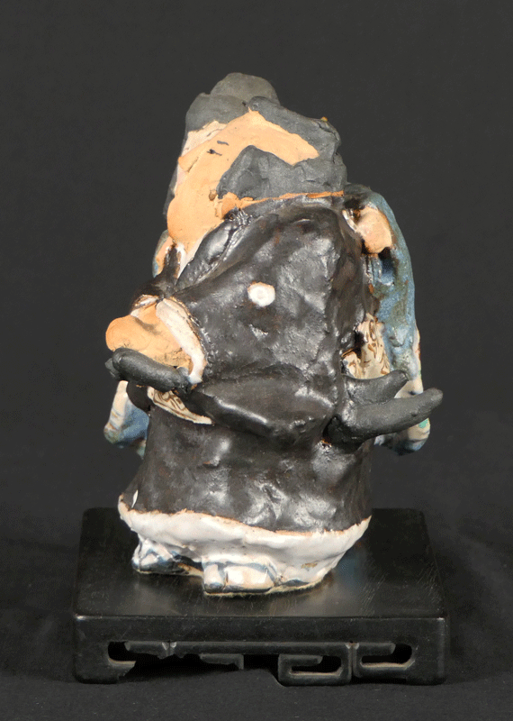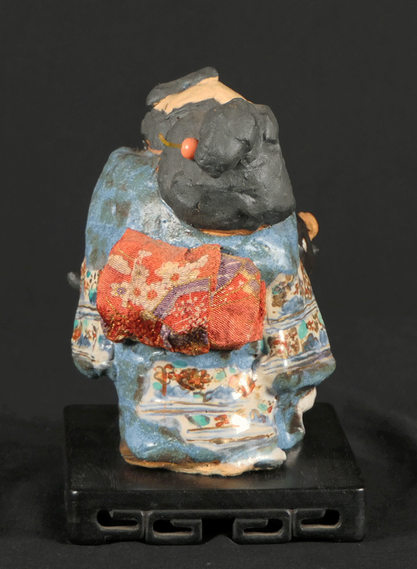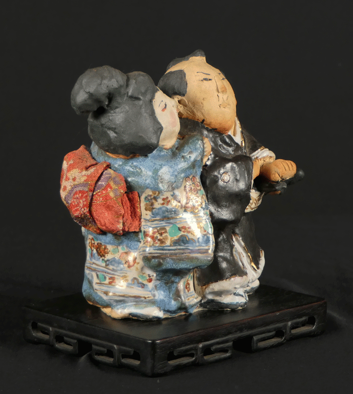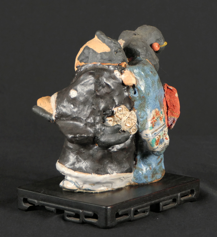 江戸時代の色町での情景をユーモラスに表現して秀逸です。 とても味のある作陶です。 木製台座に一部欠けがございます。 作品サイズ・高さ14.6㎝ 幅14.4㎝ 奥行10.2㎝ 重量1.1kg