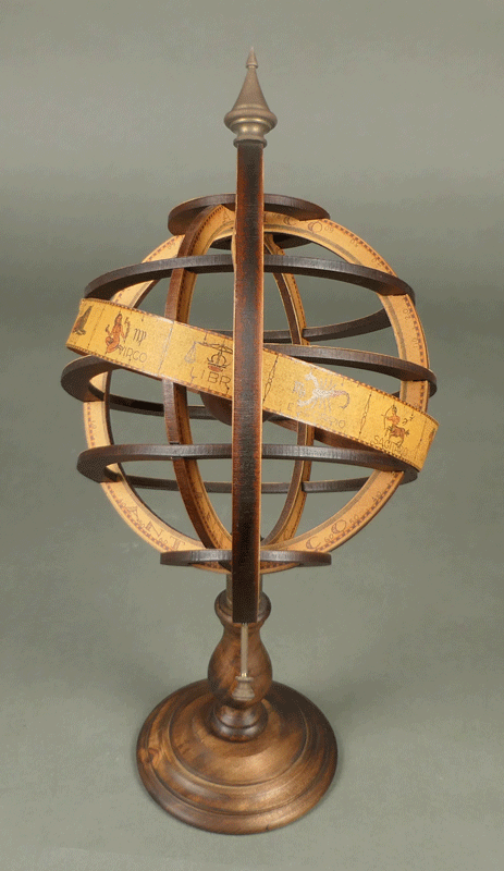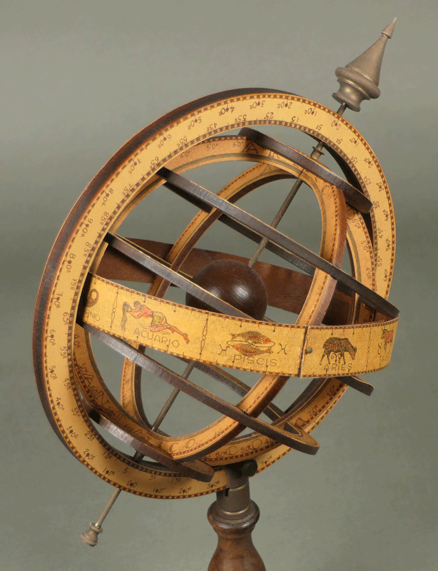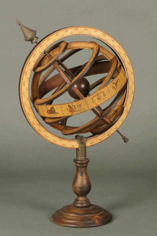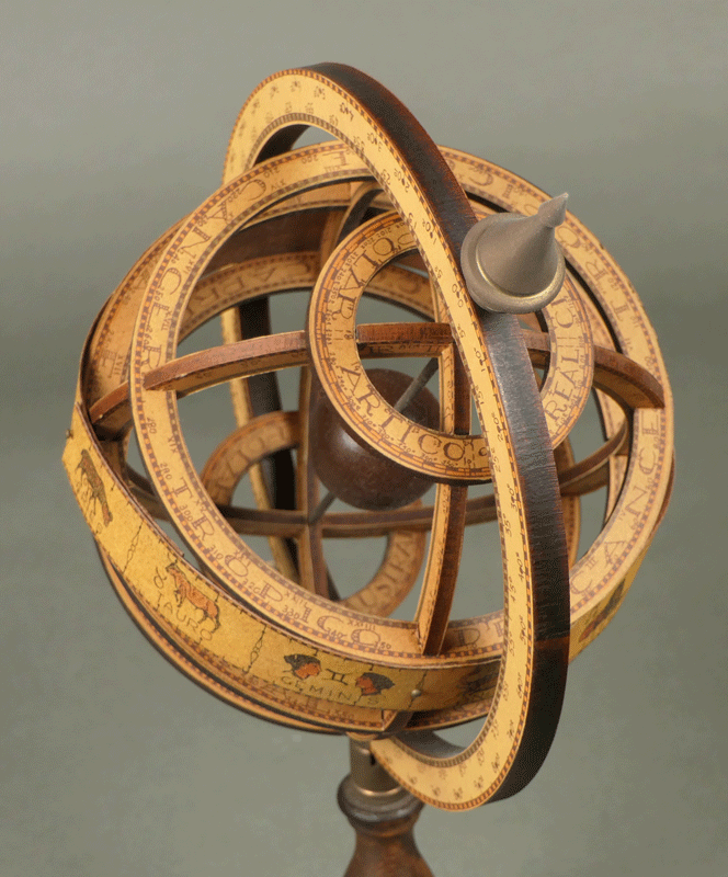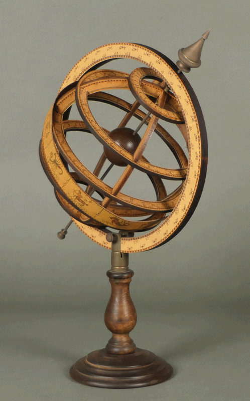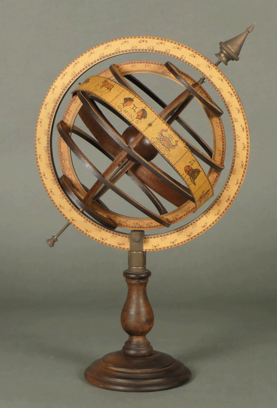 いにしえの天文学を象徴する器具であり、ルネサンス期の科学者の肖像では、しばしば天球儀を片手に持った姿が描かれています。これは知恵と知識の象徴だったからです。ちょっとマジカルな匂いのする小道具として、「ハリーポッター」「ノストラダムス」などの数多くの映画にも登場しています。