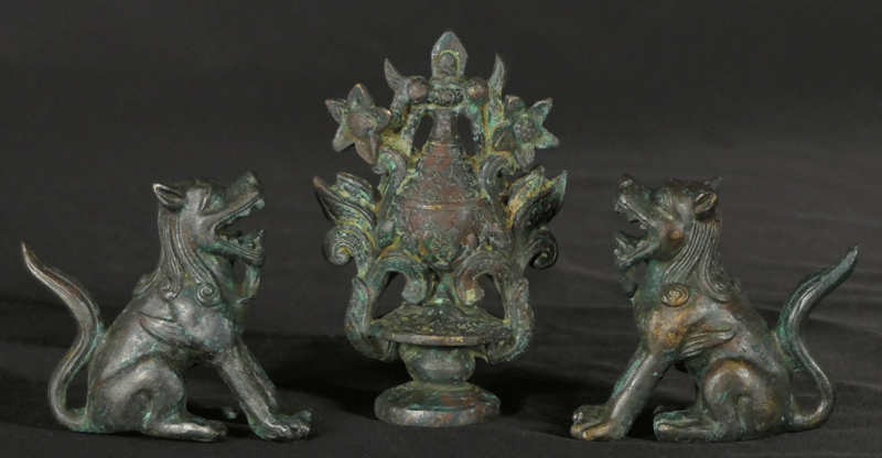その前方には花弁が装飾された大きな香炉が据えられ、その左右に獅子が置かれています。
