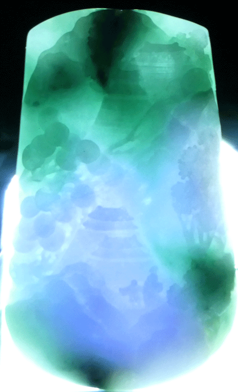 今回のお品は薄肉彫の高度な技法で楼閣山水図が表現されています。