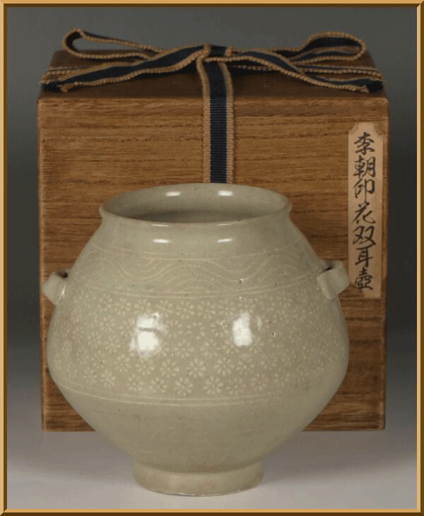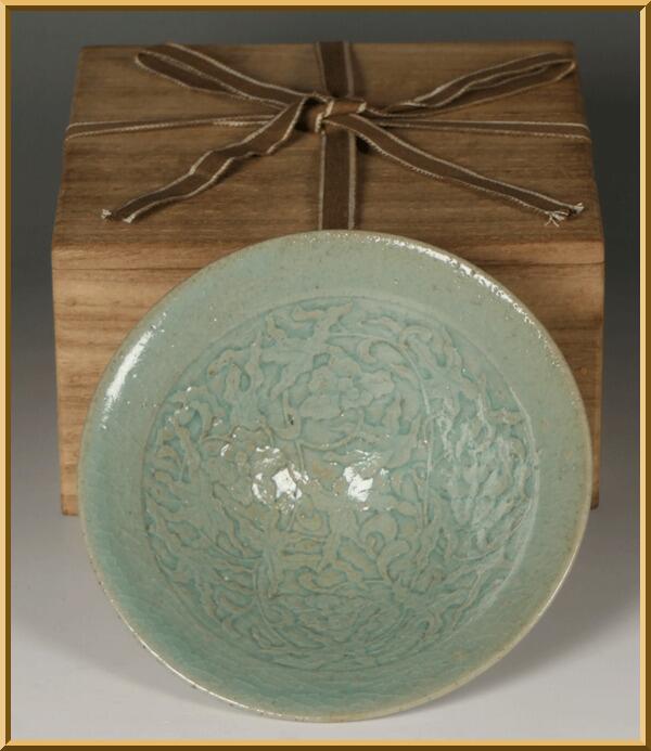 高麗青磁 輪花象嵌菊花文 龍耳盃