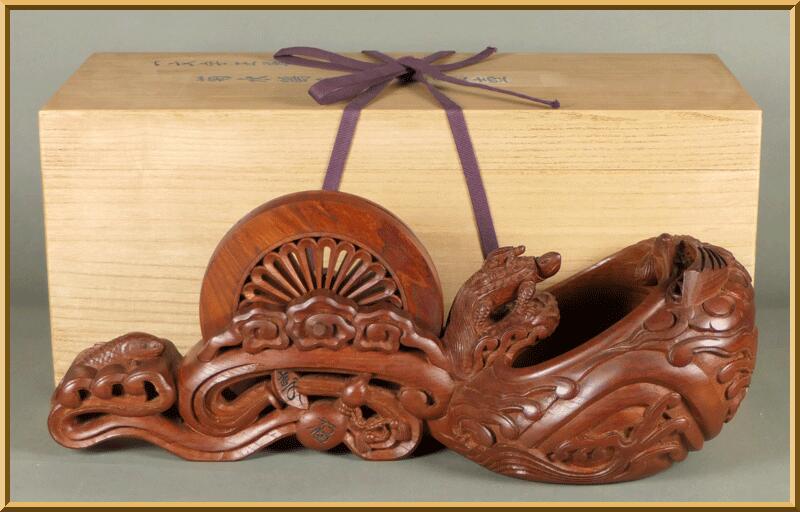 菊水形鶴亀鯉彫墨壷 一文字正兼 作