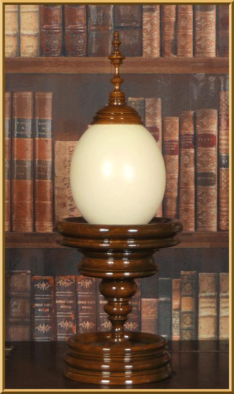 オストリッチ・エッグ(駝鳥卵)に木製のスタンドとフィニアル(擬宝珠・ギボシ)を仕立てたものです。 再生のシンボルとされる卵を、このような木製の飾り台に載せるだけで、西洋的なオブジェに早変わりします。 轆轤(ろくろ)細工のフィニアルとスタンドは、まさに匠の仕事です。 洋風インテリアのお部屋には勿論のこと理科系、ヴンダーカンマー(驚異の部屋)系の書斎にはぴったりのお品です。 サイズ・高さ44㎝ 最大幅16.5㎝