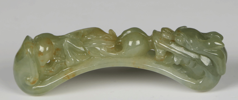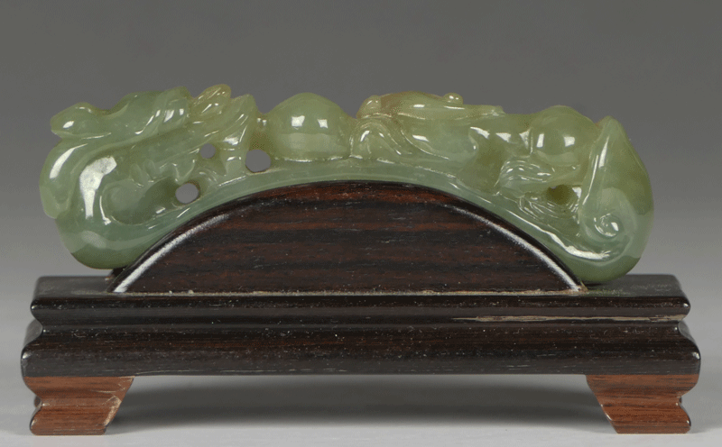 龍と虎が仙桃を取り合っている構図の筆架の逸品です。 状態は良好です。 作品サイズ・高さ2.5㎝ 最大幅7.8㎝ 飾り台付属