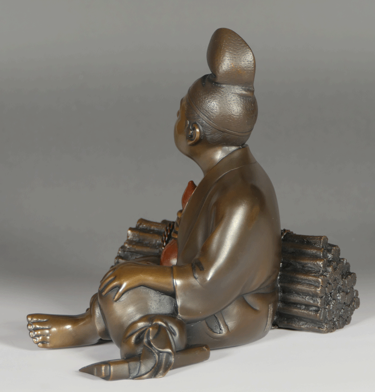 寄りかかる、縄で括られた薪の束も精緻に表現され、手にする瓢箪の着色も見事です。
