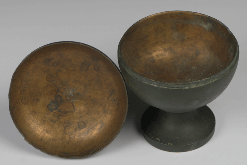 とても珍しい塔鋺形盒子(とうまりがたごうす)です。塔碗形合子とも表記されます。球体形の盒子で蓋には相輪形の紐(ちゅう)を立て、身には台脚を備えています。こうした器形のものはインドでは舎利容器でもありました。日本では法隆寺の玉虫厨子の舎利供養図や、東大寺大佛の蓮台の蓮弁線刻などにも見ることが出来、これらの内容から柄香炉とともに香合として用いられたようです。似たものに正倉院宝物や、日光男体山から出土したものがあります。 サイズ・14㎝ 最大幅7.2㎝ 材質・黄銅 箱あり