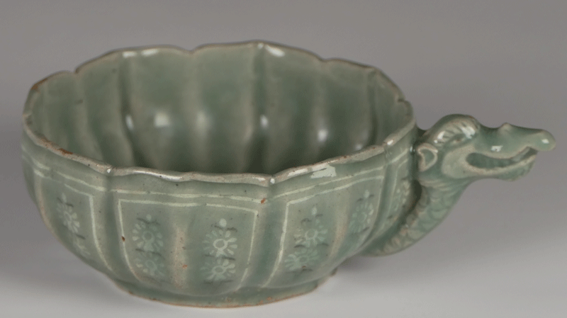 高麗青磁の輪花象嵌菊花文龍耳盃の逸品です。 八稜の花弁形の盃に立菊文が黒白象嵌されています。 把手(耳)は龍頭をかたどり、顔の表現も凄みがあり、頸の鱗も精緻に表現されています。 龍の両眼には小さい鉄班点を押して眼球を表しています。 淡緑灰青系の釉色は深みがあり、龍の印刻や立菊の象嵌を引き立る効果がございます。 口縁と高台に若干の釉剥げがあるほかは、時代を鑑みてお品の状態は極めて良いほうだと思います。 作品サイズ・高さ4.1cm 口径9.5㎝ 最大幅12.8㎝ 箱あり