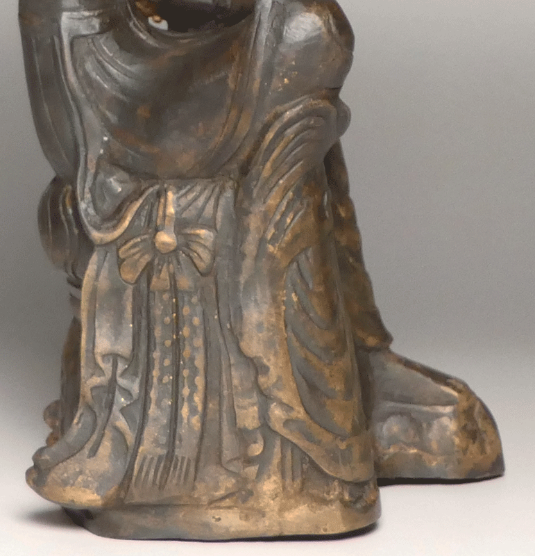 台座の正面・側面にかかる裳は、自然味のある衣文表現になっています。 鍍金は所々に残り鈍く光っています。