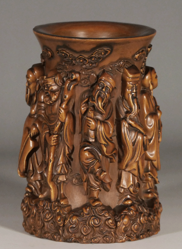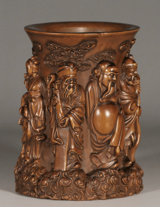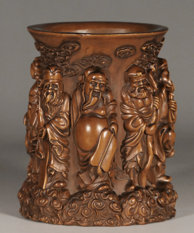 中國の八人の仙人(八仙)を浮き彫りした筆筒の名品です。