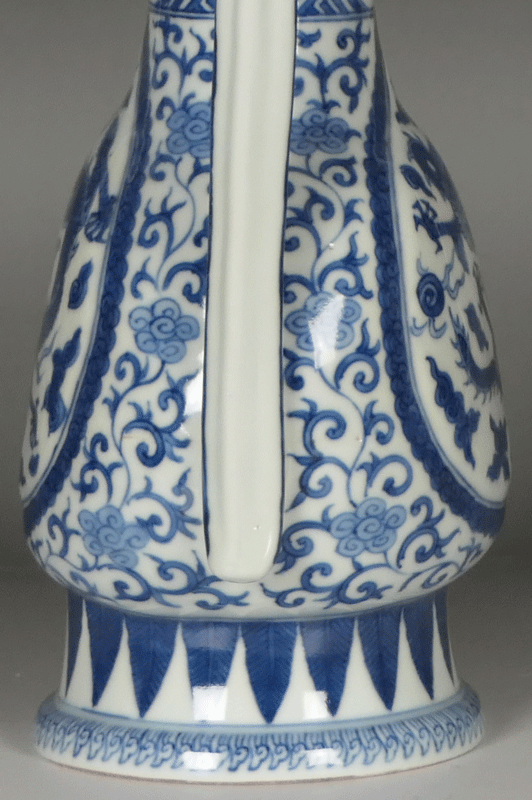 器形は、下膨れの胴部に太い頸部を持つ玉壺春タイプの瓶に、細く長い注嘴(ちゅうし)と、扁平で華奢な把手がバランス良く配されています。