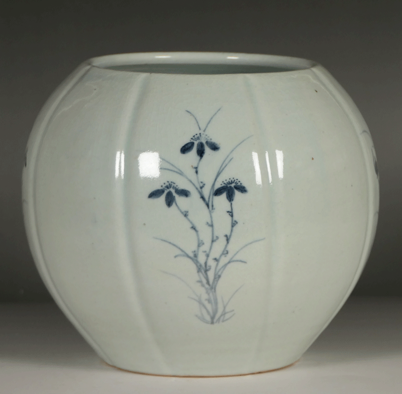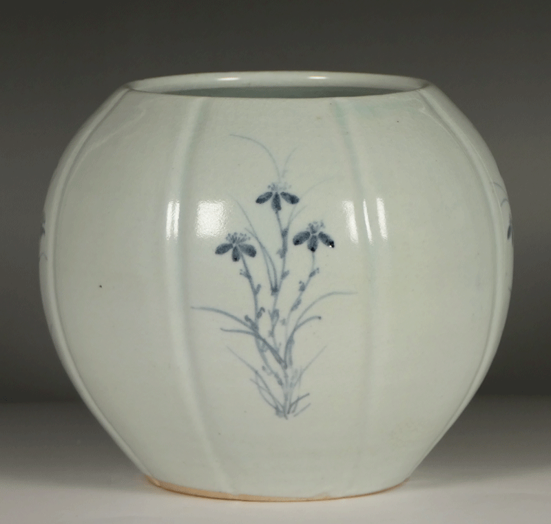 李朝染付秋草文壷の名品です。 胴部に八稜が入り、一面の間隔をあけて四面に草花文が施されています。 日本で俗に云う秋草を、細筆で優美に描いています。 この流麗で伸びやかな筆致は画員の手になるものでしょう。 こじんまりとした丸壷に八稜が入り、とても美しい器形です。 白磁に描かれた呉須の色合いも深みがあり、見るものを飽きさせません。 お品の状態は良好です。 作品サイズ・高さ15㎝ 口径10.6㎝ 胴径17.6㎝ 重量1kg 箱あり