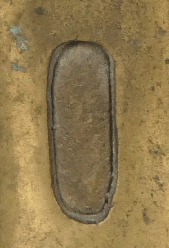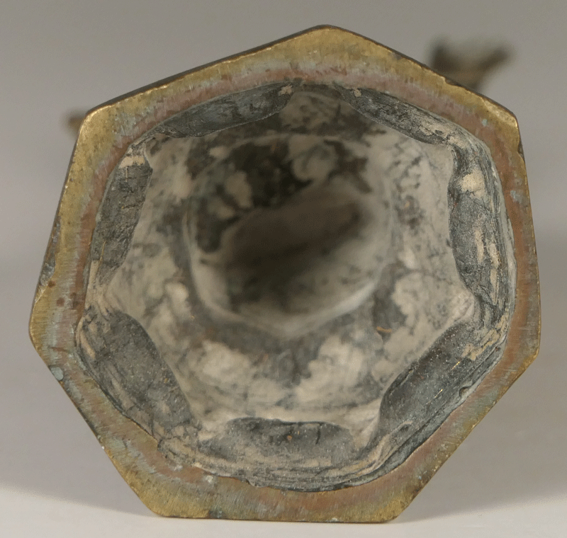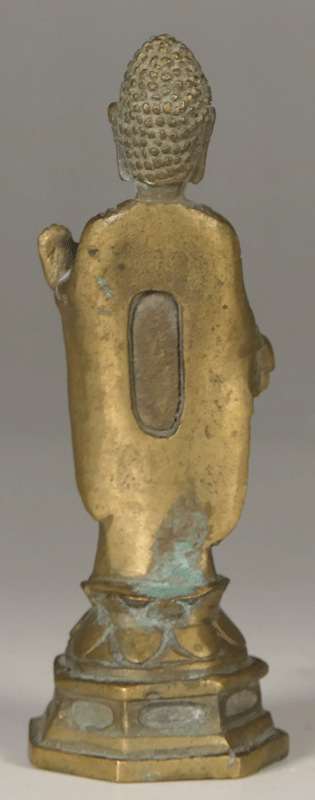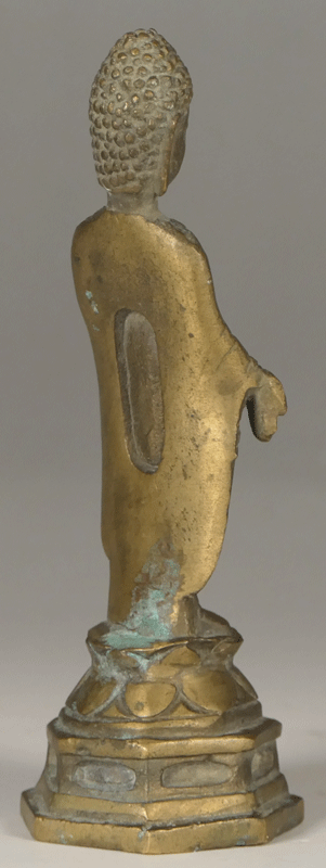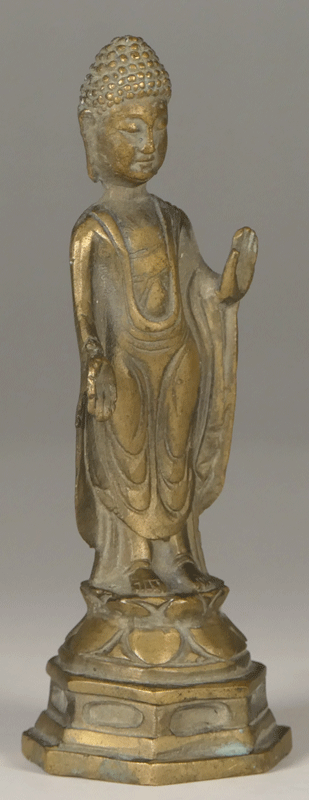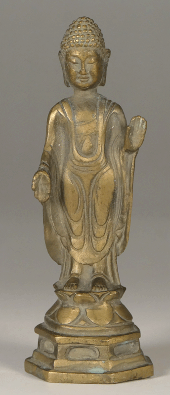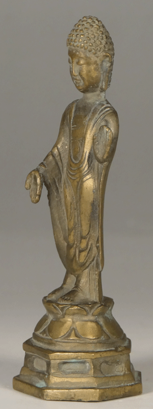 金銅如来立像の逸品です。 古式微笑を湛え、慈悲に満ちた、優しいお顔をされています。 眉と目は長く刻まれ、伏目がちです。 長身痩躯ですが、頭部は幾分大きめです。 螺髪は細かく造られています。 サイズからみて念持佛・懐中佛として造像されたものでしょう。 懐中佛にしては框(かまち)座、蓮台等しっかりと造られています。 統一新羅様式の特長が顕著な作品です。 作品サイズ・総高11.8㎝ 框座4.1×3.9㎝ 重量126 箱あり