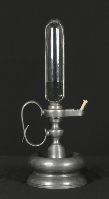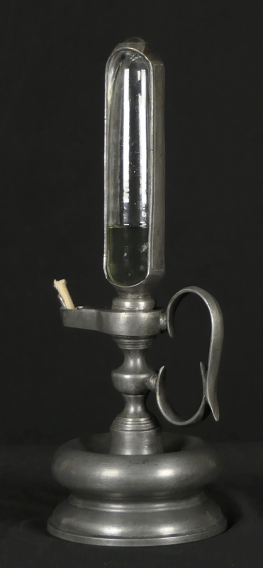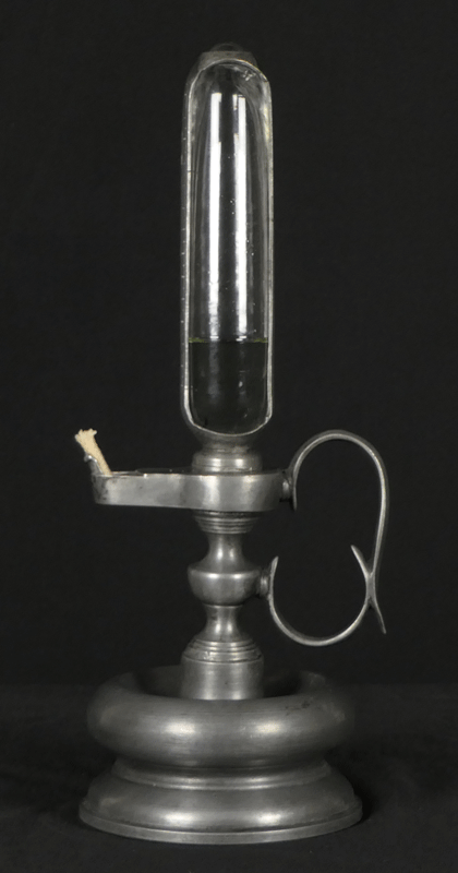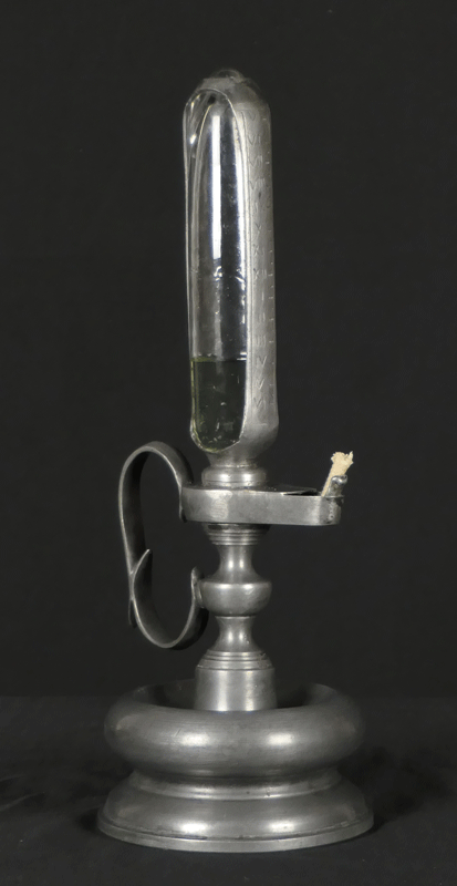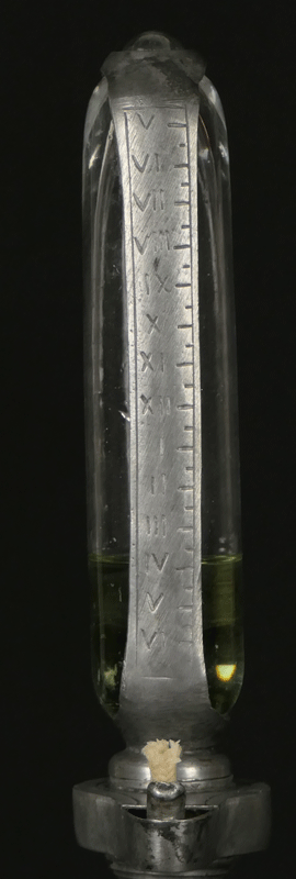 全体はピューターで出来ています。油壺のガラスを包む枠にローマ数字で目盛りが刻まれています。