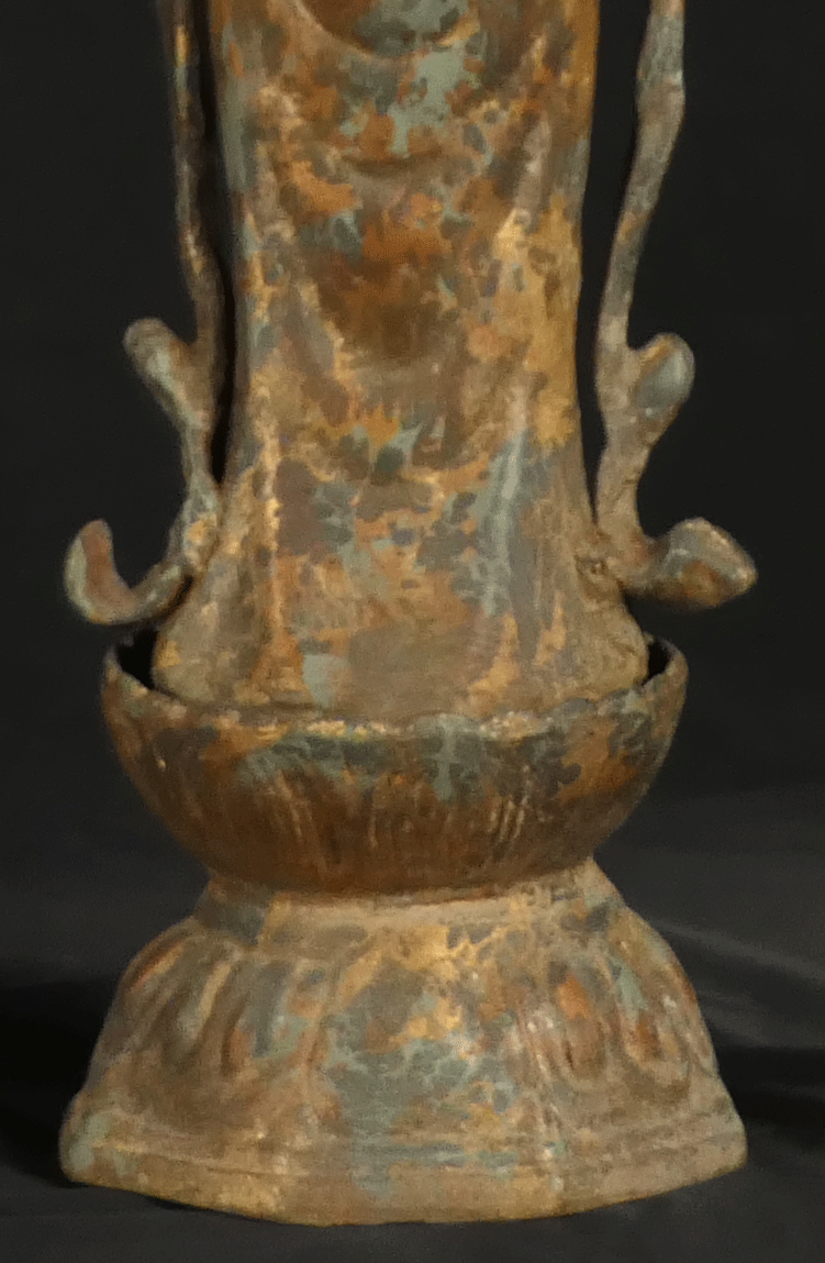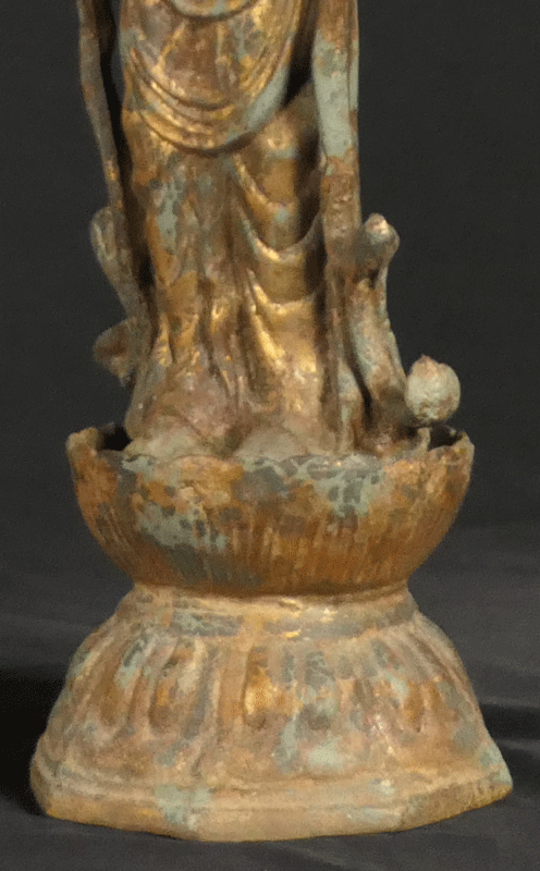右手は降ろし、左手は屈臂していますが持物は失われています。