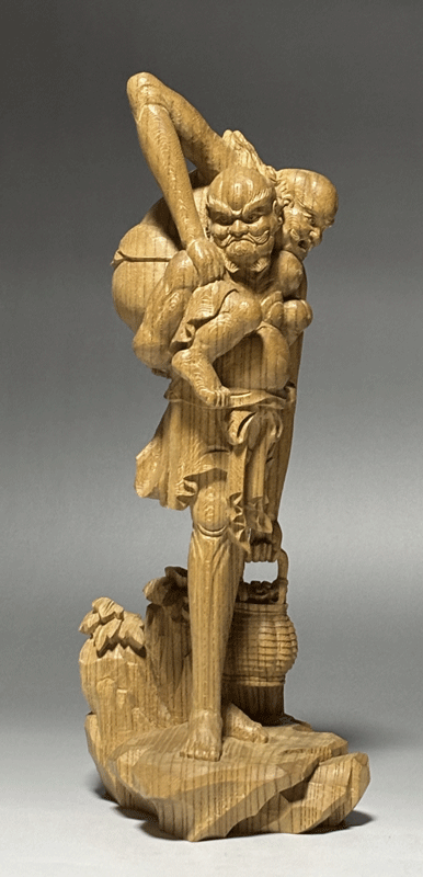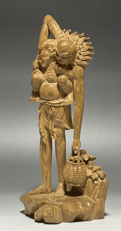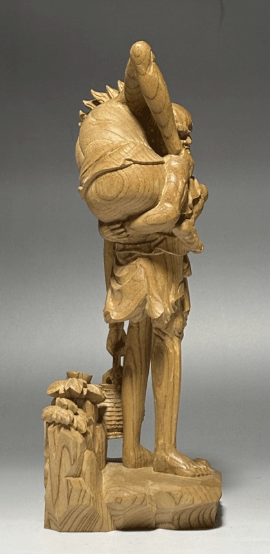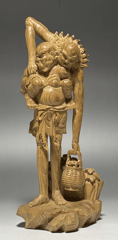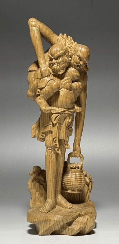 置物としての手長足長はそれぞれ単体で造られるのが普通ですが、今回のお品は二人を見事に融合させた構図になっています。
